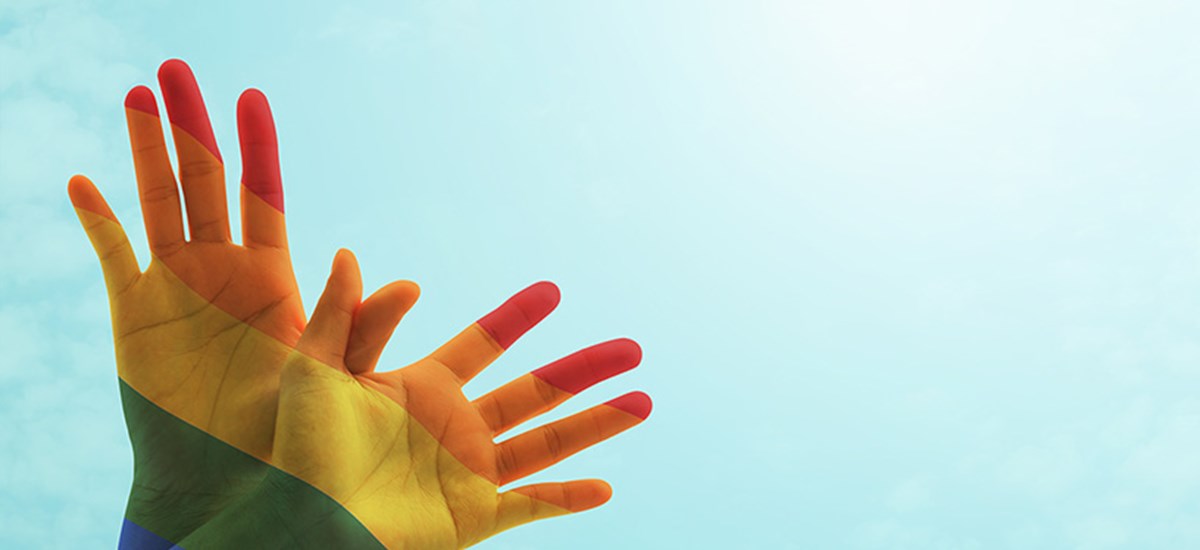 Et filter med regnbueflaggets farger lagt over hender foldet som sommerfugl i fri flukt. Fra en null-diskriminerings-kampanje. | © Chinnapong / Shutterstock / NTB scanpix