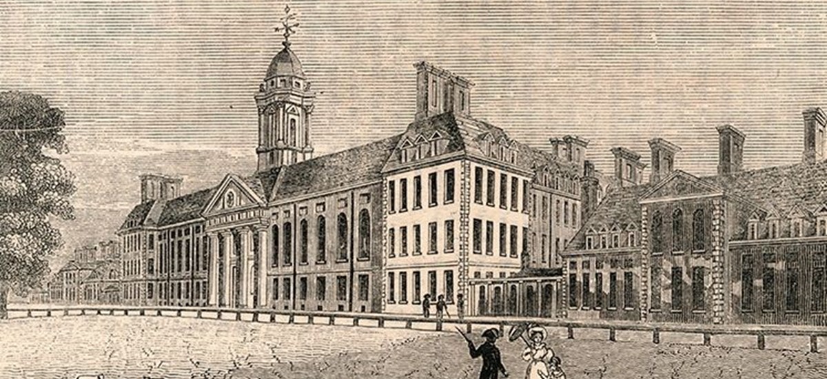 Chelsea Hospital i London hvor kvinner fikk klitoris og de indre kjønnsleppene fjernet fordi de led av menstruasjonsforstyrrelser - postkort fra 1845.